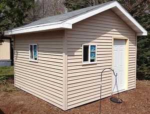 Custom 12' x 12' gable style shed built on a concrete slab, vinyl siding (sandstone color), 24" x 24" sliding vinyl windows, steel service door, one foot overhangs with boxed ends, 8 foot wall heights, and 30 year warranty 3-tab shingles (estate gray color).